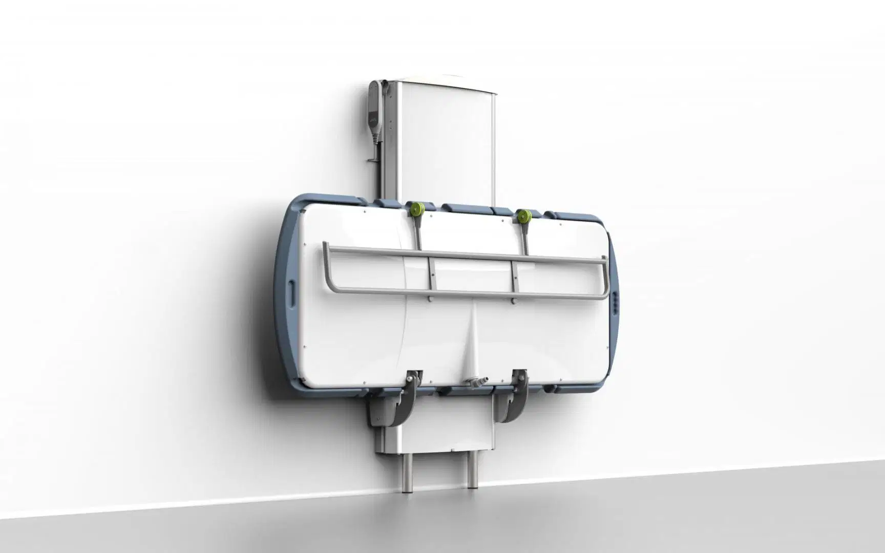 This wall mounted changing table combines many practical and aesthetic features to allow the complex needs of daily care giving to be conducted in a comfortable and relaxed manner for both the care giver and cared for.